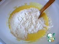 Муку, крахмал и разрыхлитель просеять и соединить с желтковой массой. |