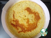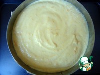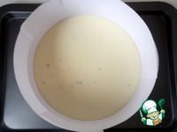 Форму-кольцо выложить файлами или бумагой. На дно положить первый корж и вылить на него половину крема. |
