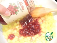 Добавляем брусничный соус D'arbo. Тушим еще минут 5. Выливаем апельсиновый сок, добавляем корицу, мускатный орех и мед. |