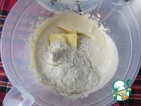 Добавить к желтково-сахарной массе мягкое сливочное масло и 3 столовых ложки муки. |