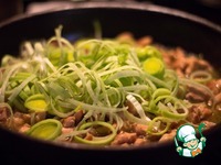 Добавить нарезанный кольцами лук-порей. Готовить еще 5-7 минут (до готовности мяса и уваривания соуса), без крышки, помешивая. |