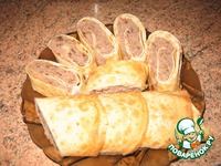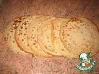Из муки, молока, яиц, соли и растительного масла приготовить жидкое тесто для тонких блинов. Испечь на сковородке 6-8 блинов.
