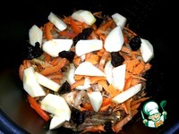 Выложить утку в чашу мультиварки (или в другую емкость, если будете тушить на плите или в духовке). Туда же отправить нарезанный полукольцами лук, морковь брусочками, чернослив порезанный пополам, яблоки ломтиками. Приправить солью, специями по вкусу. Можно добавить 1 мультистакан воды, но не обязательно, т. к. утка выделит много жира, в котором и будет тушится.