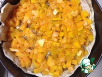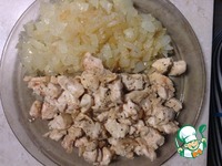 Чистим тыкву и режем кубиками ~ 1*1 см. Посыпаем мускатным орехом и немного соли. Теперь укладываем слои в форму. Лук->курица->лук->ты ква. |