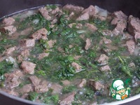 5. К мясу добавить промытый и порезанный или заморженный шпинат. У укропа удалить грубые стебли, остальное мелко порезать и тоже добавить к мясу. Тушить все вместе еще около 3 минут. |