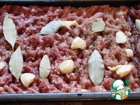 На слой соуса выкладываем слой полосок из утки и после покрываем слоем оставшегося фарша. На последний слой фарша кладем три лавровых листа, краями свиной сетки накрываем пате. |