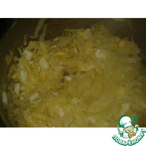 Переложить в кастрюлю с капустой. Яйца мелко порезать, как для оливье. Добавить к капусте. Всё тщательно перемешать. Начинка готова. |