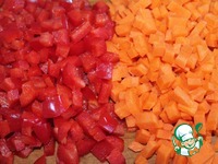 Морковь и перец нарезаем мелкими кубиками. Можете морковь измельчить с использованием терки, но так намного симпатичнее. |