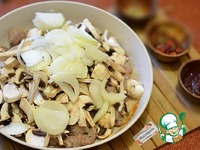 Вторую головку лука нарезать полукольцами. Грибы нарезать шайбами. Добавить к обжаренному мясу. Жарить ещё 2-3 минуты. Долить воды и оставить тушить. |