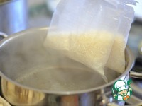 К этому времени закипит вода для риса. Посолить воду по вкусу. Положить два пакетика риса (Мистраль Индика длиннозерный). Закрыть крышкой и варить 20 минут. |