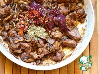 Когда вода в сковороде с мясом и грибами выпарится, добавить сушеную паприку, соус ткемали и орегано. |