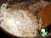 Добавьте рис, и обжаривайте его не больше 2-х минут, постоянно помешивая. |
