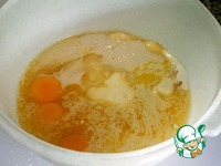 Добавить молоко с растворенными дрожжами, соль, сахар, 3 яйца, растопленное сливочное масло. |