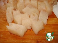 Пока лук на сковороде нарежим рыбное филе кубиками. |