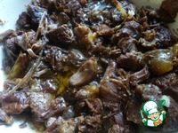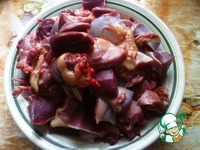 Я обрезала мякоть с гуся и немного мяса на кости взяла, порубила. Также взяла 2 пупа гусиных и два сердца. |