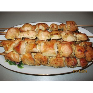 Затем нанизать кусочки филе на деревянные шпажки. Запекать в духовке при температуре 250 градусов 15-20 минут. |