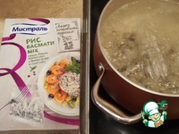 Наливаем в кастрюльку воду, добавляем соль (1/2 ч. л.), ставим на огонь и доводим до кипения. Пакетики с рисом Басмати mix кладем в кипящую воду и варим на медленном огне 12 минут. |
