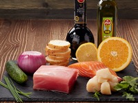 Подготовить все продукты. Разморозить гребешок, тунец и лосось. Все помыть под холодной проточной водой, затем обсушить при помощи салфетки. |