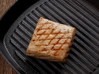 Тунец поперчить, посолить и обжарить на гриль сковороде. |