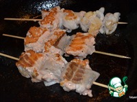 Обжариваем на горячей сковороде со всех сторон рыбные шашлычки. |