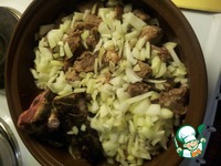 Блюдо нужно готовить в открытой посуде, я использовала керамическую. подрумянить кости и порезанное кубиками мясо |