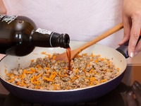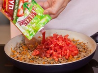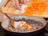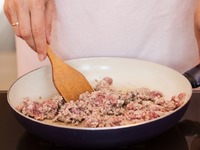 Разогрейте масло в большой сковороде на среднем огне. Выложите в сковороду фарш и обжаривайте, пока он не приобретет коричневый цвет. |
