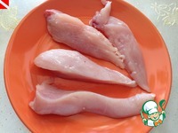 Готовим куриные грудки, разрезаем их на две части вдоль, убираем кусочки жира |