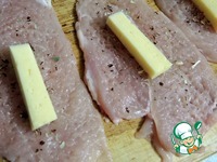 Грудку разрезать на тонкие платины, отбить, посыпать приправами. Сыр порезать крупными ломтями и выложить на грудку. |