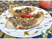 Сверху полить соусом и присыпать предварительно нарезанной зеленью и кедровыми орешками. |