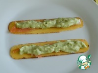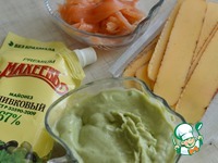 3. На полоску сыра выложить полоску лосося, сверху крем из авокадо. |