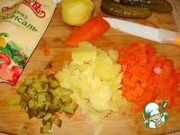 Картофель, морковь отварить, почистить, нарезать кубиками. Маринованный огурец тоже нарезать кубиками. |