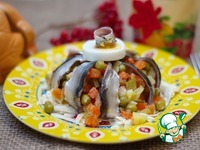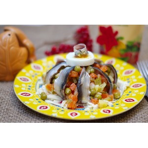 Украсить сверху кильками и яйцом. |