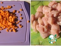 Так же нарезать морковь. Куриное филе нарезать на кусочки примерно 2х2 см. |