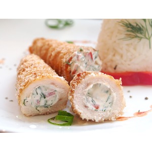 Куриные трубочки обвалять в панировочных сухарях и выложить в форму, смазанную оливковым маслом. Выпекать в духовке, заранее разогретой до 220 градусов, 25 минут. |
