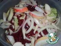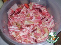 Затем промыть в чистой воде, слегка отжать руками, стряхнуть воду, нарезать на полоски по 4 -5 см, добавить измельченные лук и чеснок, красный молотый перец, тертый буряк. Можно добавить молодые огурцы. Все перемешать и выложить в посуду для засолки. |