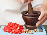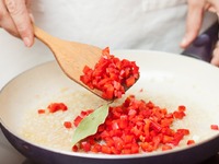Разогреть растительное масло и обжарить лук, 5 мин. Добавить сладкий перец и лавровый лист, готовить еще 5 мин. |