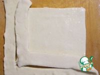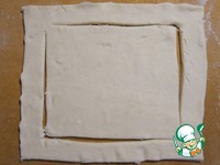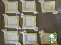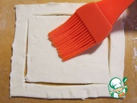 Смазываем весь квадрат белком. Это необходимо для того, чтобы корзиночка во время выпекания склеилась в единое целое и не пропускала сбоку начинку. |