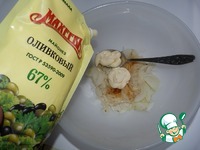 Делаем маринад. Для этого нарезать полукольцами лук, добавить по необходимости и по вкусу соль (я соль вообще не добавляю, поскольку майонез), черный молотый перец (можно смесь перцев) и яблочный уксус. Чуть перетереть рукой. Затем добавить оливковый майонез. Все хорошо перемешать.