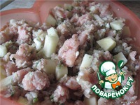 Мясо промыть, отделить от костей и нарезать мелкими кубиками величиной с лесной орех. Смолоть на крупной решетке вместе с чесноком, луком и зеленью. Добавить еще 1 луковицу крупно нарубленного лука. Картошка нарезать такими же кусочками и положить его в холодную воду, чтобы он не потемнел. Затем откинуть на сито, дать стечь воде, соединить с мясом, положить мелко нашинкованный репчатый лук, масло, перец и соль и все тщательно перемешать - фарш уложить в глубокую посуду.