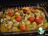 Очень красиво уже. А когда овощи слегка дойдут в духовке, красота не потеряется, но добавится еще и сладость и мягкость овощей. |