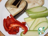 Цуккини, перец и баклажан порезать тонкими ломтиками |