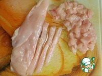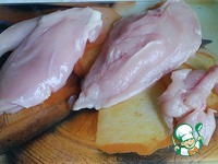 Включаем музыку и приступаем )) Куриную грудку промываем, снимаем шкурку. Отделяем филе, получается 2 пласта, их еще режем вдоль, чтоб получилось 4 тонких пласта. |