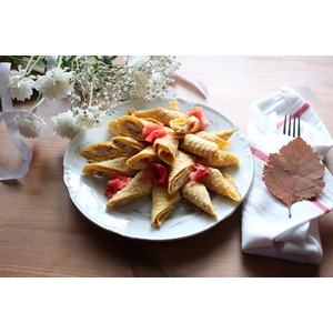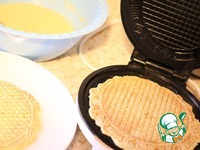 10. Разложить вафлю на рабочей поверхности, выложить столовую ложку начинки и свернуть вафлю в трубочку. |