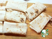 Листы лаваша делим на полосы. У меня получилось восемь полос размером 30*15 см. Сворачиваем из них кулёчки, дно подгибаем. |