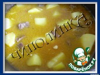 После, картофель, заливку выложить к мясу, добавить воды, что бы она все покрыла, специи и тушить до готовности картофеля. |