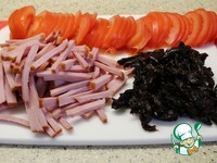 Нарезаю ветчину и чернослив соломкой, помидоры - пополам, затем тонкими ломтиками. |