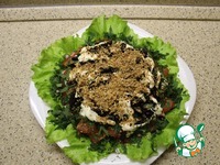 Завершаю слоем грецких орехов. При подаче дополнительно посыпаю по краям салата зелень и несколько черносливен фарширую ядрышками ореха. |