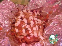 Оставшуюся смесь кладем вокруг курицы. Сбрызгиваем соком лайма и рисовым уксусом. Закручиваем курицу в фольгу и в предварительно разогретую духовку отправляем ее жариться на час. |