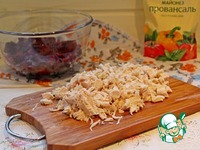 Отварное куриное филе тоже нарезать мелким кубиком. |