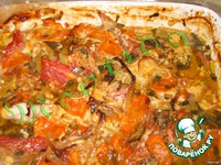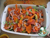 Описание: Нежнейшие куриные грудки.. перец, морковь, помидор, чеснок, лук, специи и травки.. с заправкой из красного вина и лимонного сока..